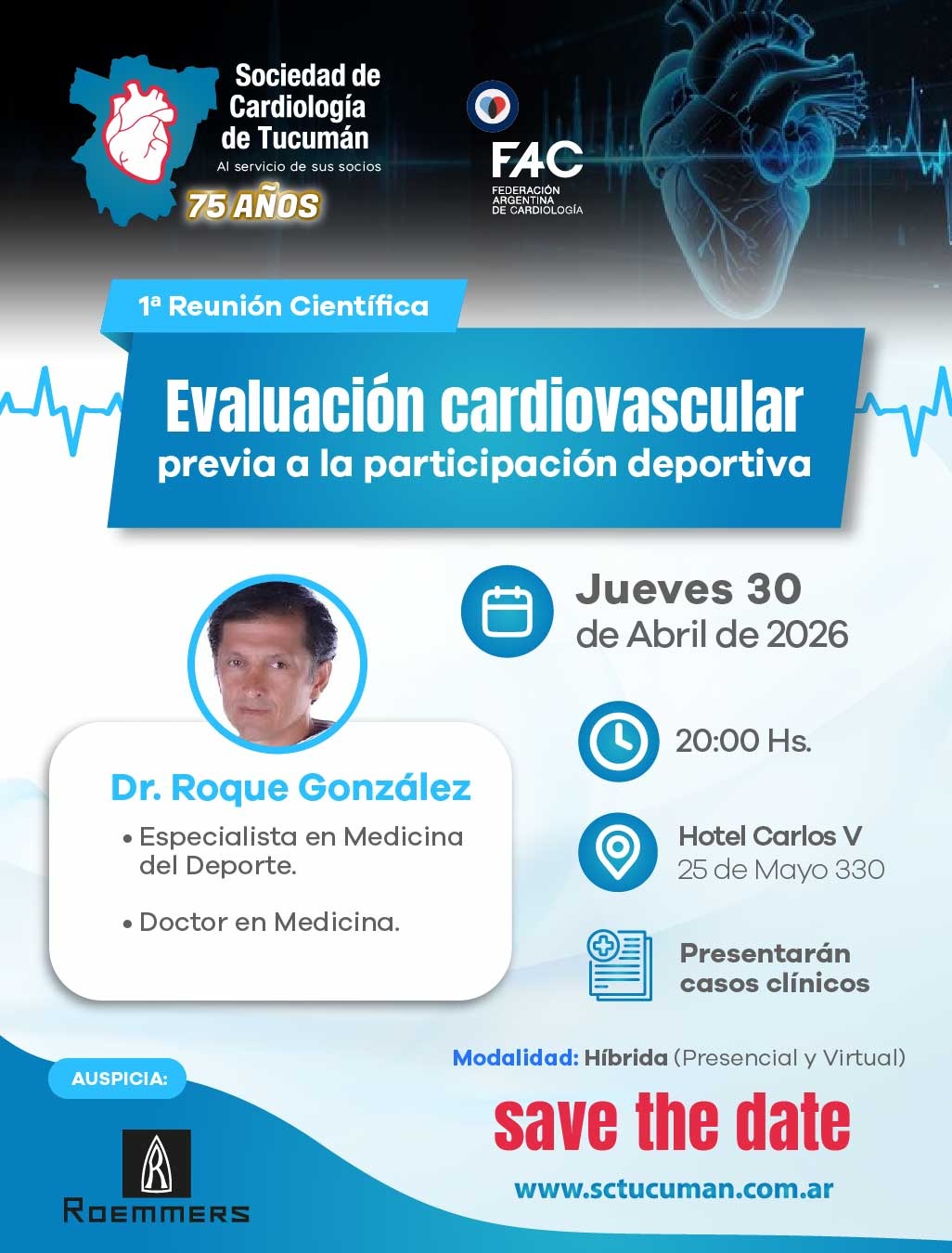 La actividad contará con la disertación del Dr. Roque González, especialista en Medicina del Deporte y doctor en Medicina, quien abordará aspectos clave para la correcta valoración cardiovascular en pacientes que realizan actividad física.