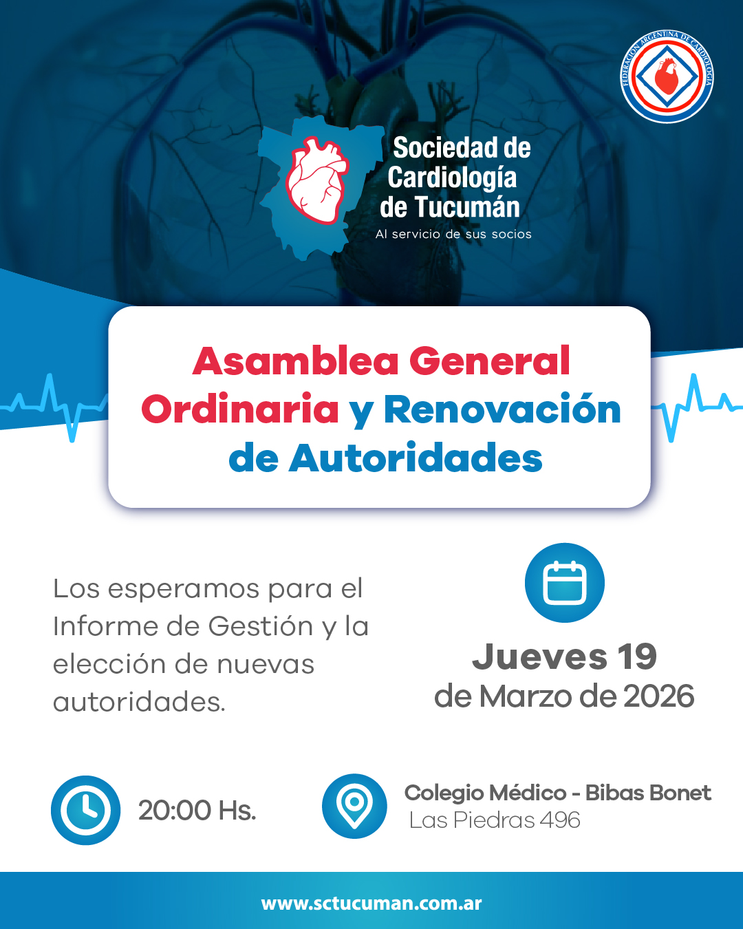 La cita será el jueves 19 de marzo de 2026, a las 20:00 hs, en el Colegio Médico (Las Piedras 496). Durante la jornada, presentaremos el Informe de Gestión del período que concluye y llevaremos adelante la elección de las nuevas autoridades que continuarán trabajando por el crecimiento y la representación de nuestra comunidad médica.
