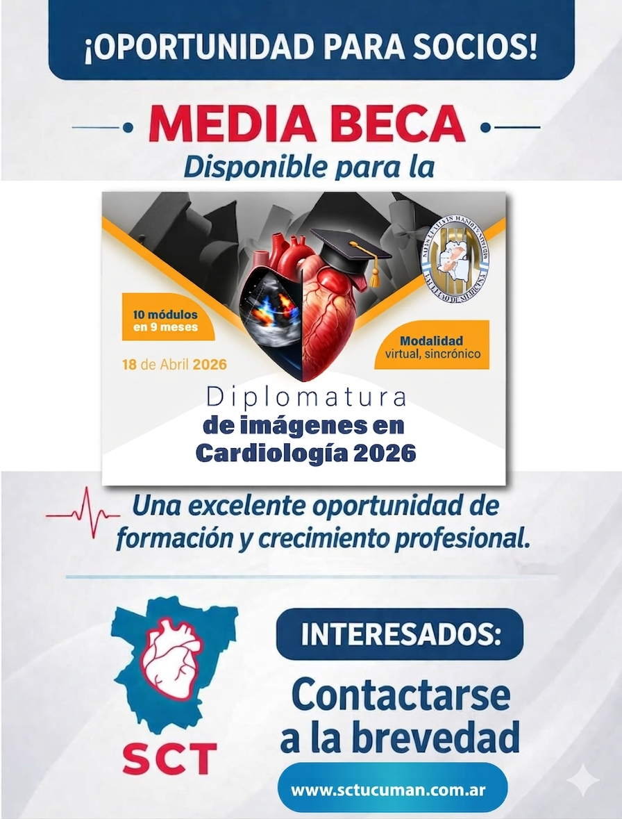 Desde la Sociedad de Cardiología de Tucumán anunciamos una nueva oportunidad de formación destinada a nuestros socios: se encuentra disponible una media beca para la Diplomatura en Imágenes en Cardiología 2026, una propuesta académica orientada al perfeccionamiento profesional en el área.